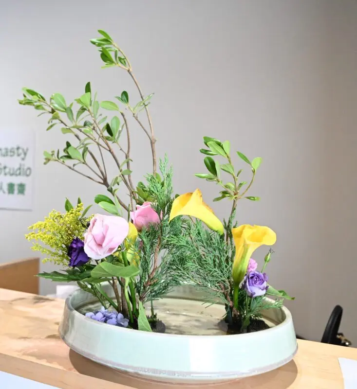 在导览环节中,李丽淑教授向来宾分享了她四十余年推广中华花艺的心路历程。她特别指出,虽然日本花道广为人知,但其源头可追溯至中国隋唐时期。中华花艺不仅历史悠久,更巧妙融合了五行方位、色彩哲学、易经阴阳以及四季节令等传统文化精髓,展现了中华美学的深厚底蕴。