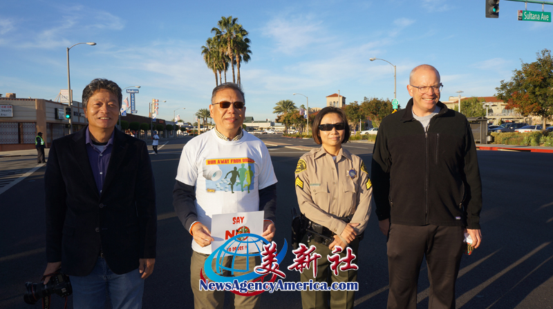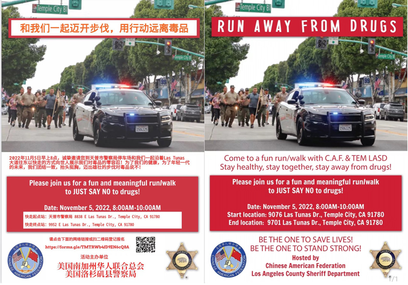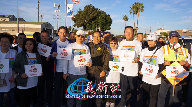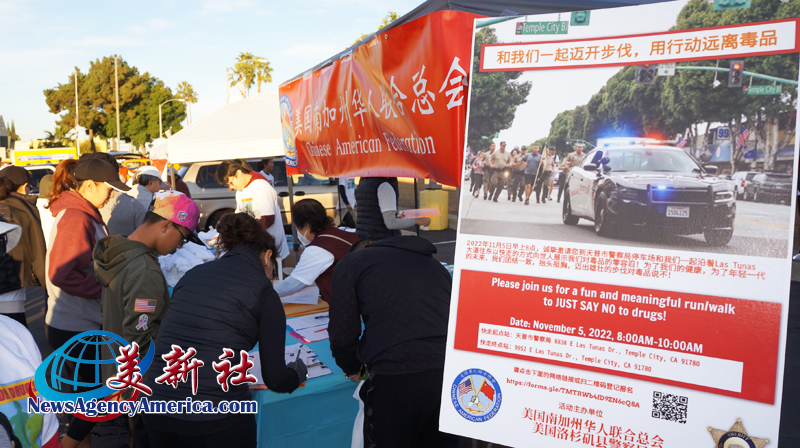 【新闻来源:美新社讯】11月5日早上八点,美国南加州华人联合总会联合洛杉矶郡警察局(LASD)于天普市分局前,共同举办“迈开步伐,远离毒品”的健走公益活动。并且诚挚邀请华人朋友,特别鼓励年轻一代一起对毒品说“不”。