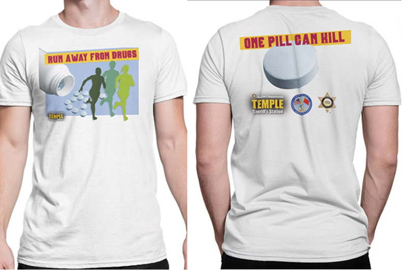 当天,每位健走公益活动的参与者都获得一件由洛杉矶郡警察局(LASD)和美国南加州华人联合总会共同印制和赠送的活动 T-Shirt,以资留念和加强宣传效果。大家身穿活动 T-Shirt,高喊英文口号“向毒品说不”,从天普市分局门口的 Las Tunas Dr. 为起点,或以跑步或以健走的方式,完成 1.5英里的路程。